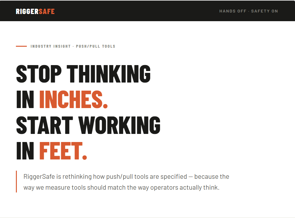 Stop Thinking in Inches — RiggerSafe RiggerSafe Hands Off · Safety On Industry Insight · Push/Pull Tools Stop Thinkingin Inches.Start Workingin Feet. RiggerSafe is rethinking how push/pull tools are specified — because the way we measure tools should match the way operators actually think. For decades, the industry has operated on a measurement system nobody […]
